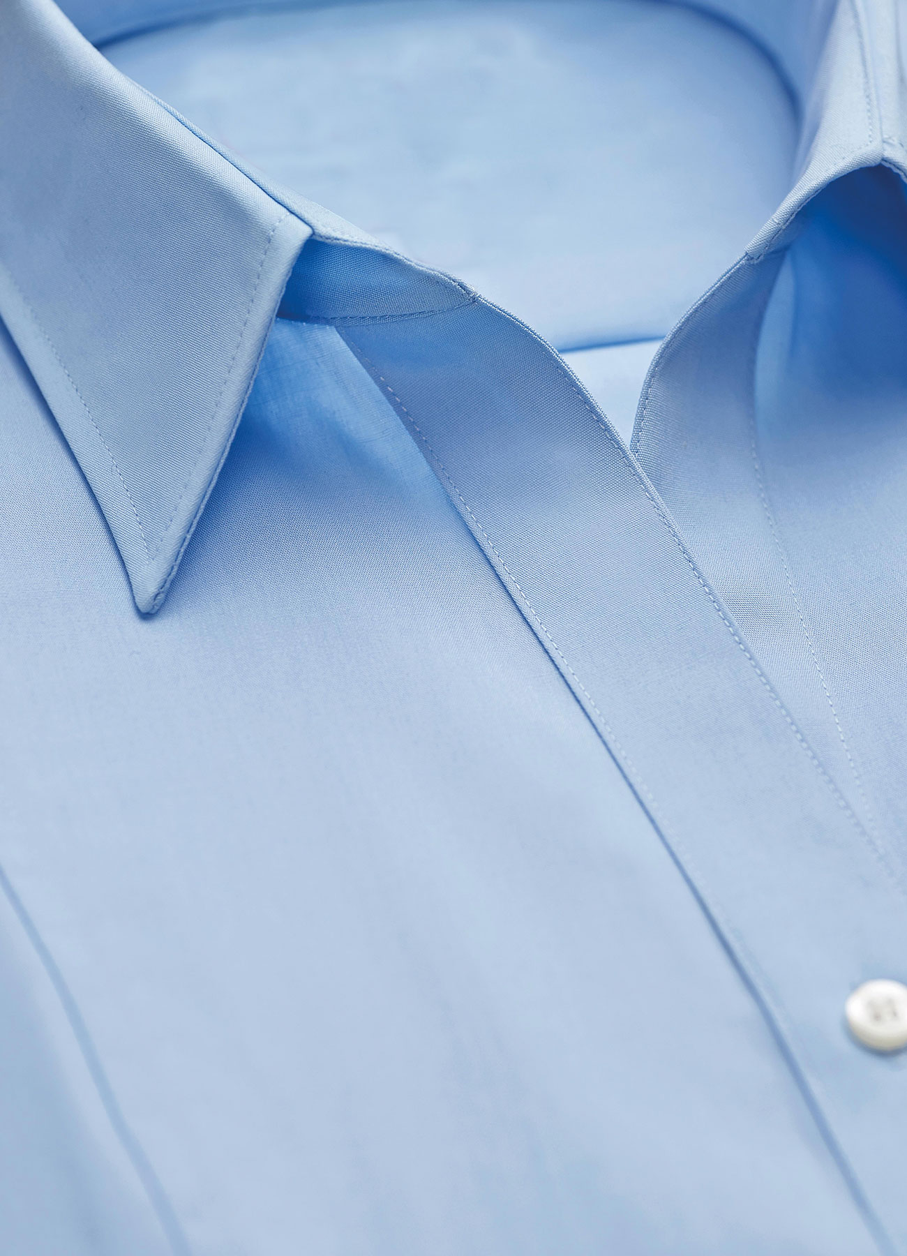 Camicia donna a maniche lunghe, vestibilità slim fit. Colletto classico all'italiana, carré e sprone classico. Riprese che sfinano la figura, che partono dalla spalla fino in vita e da sotto il giro ascellare disegnando una curva fino sopra al punto vita. Abbottonatura con bottoni a vista, cannoncino frontale e imputure a piedino.