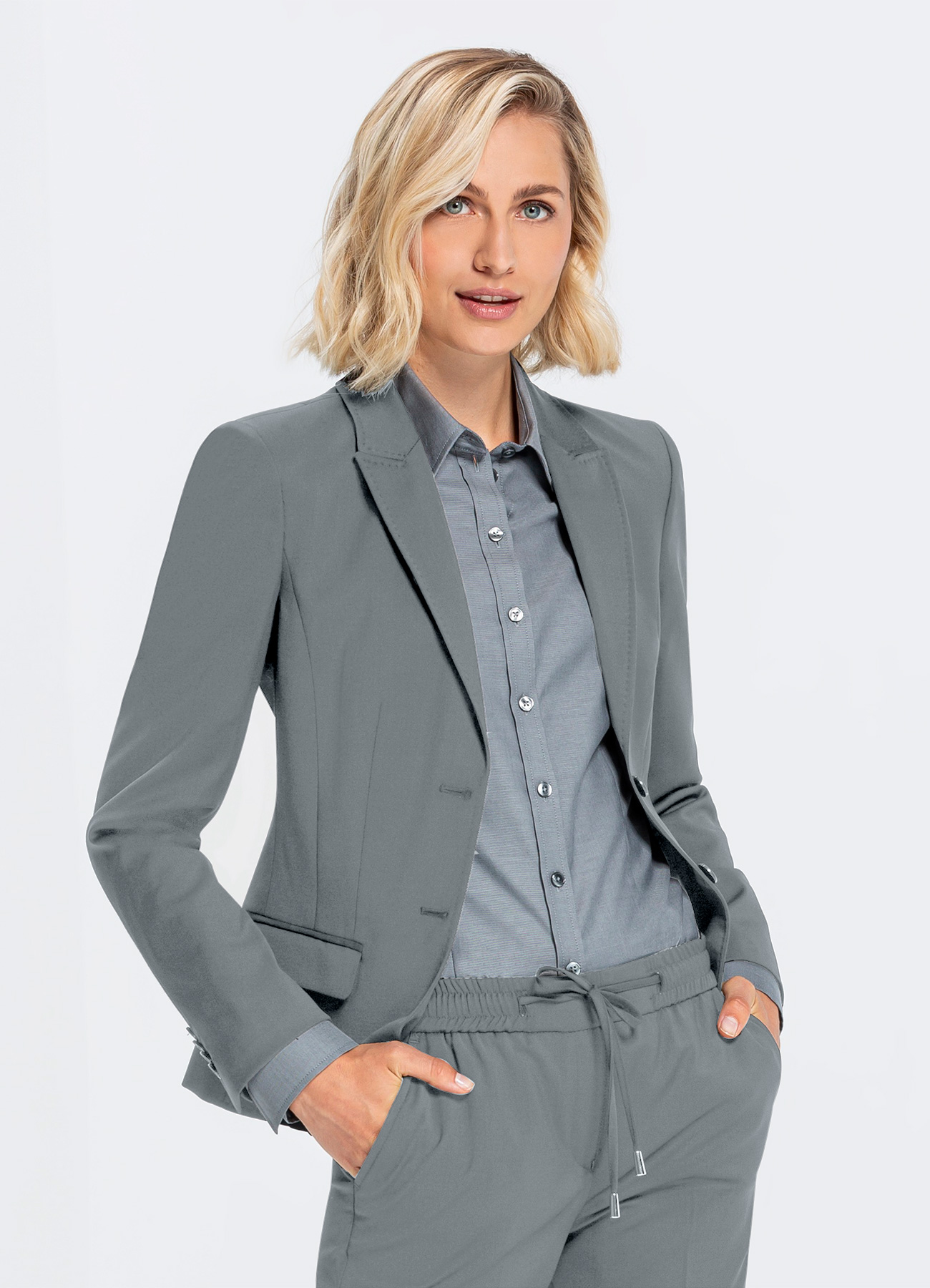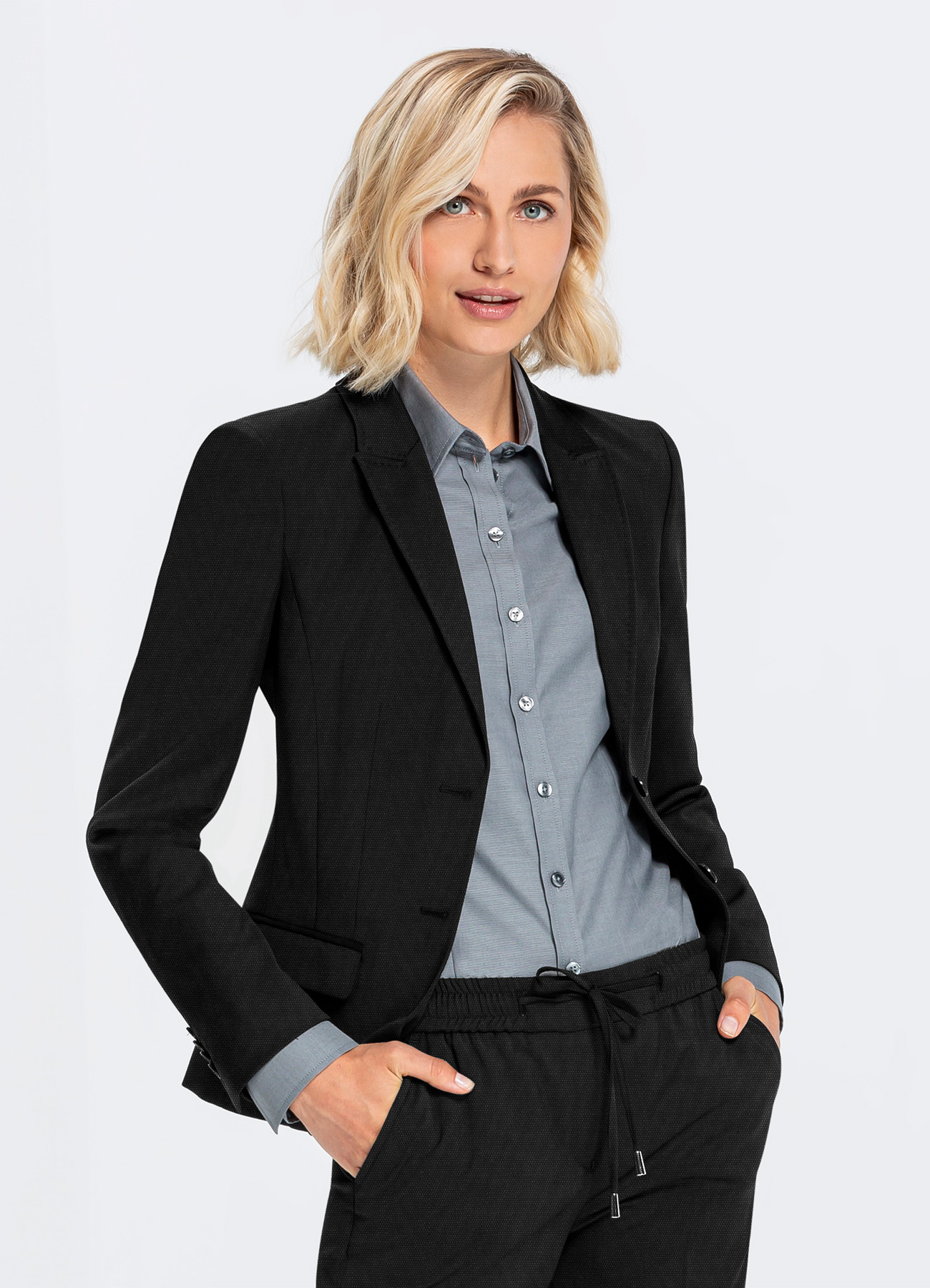 Giacca elegante donna, chiusura con due bottoni, due tasche laterali con patta, un taschino interno. Cucitura a mano AMF, spacco sul retro.
