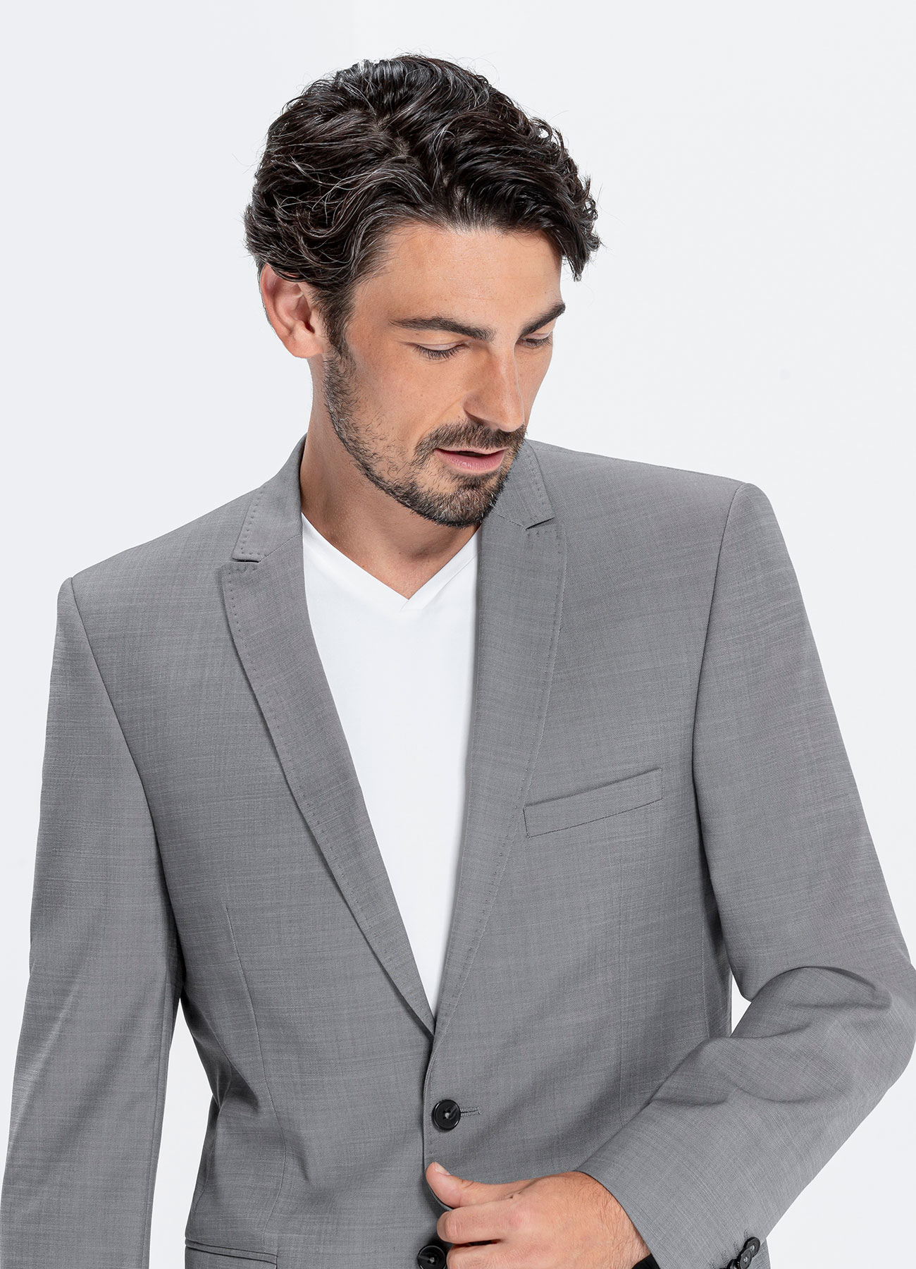 Giacca uomo con due bottoni, bavero a punta, due tasche con patta, un taschino a filetto sul petto e tre tasche interne. Semi foderata con spacchetti laterali. Vestibilità Slim Fit.
